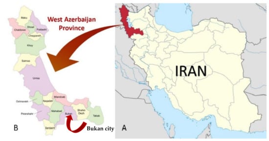 The study area. Source: Nejadrahim et al. [46]. (A): Geographical location of the study area in Iran. (B): Geographical location of the study area in West Azerbaijan Province.