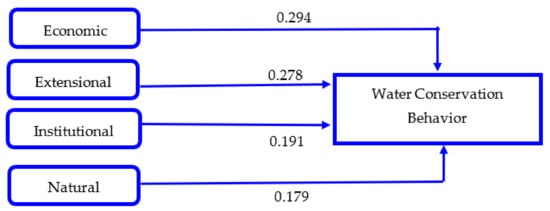 Multiple regression was used to predict the changes in the WCBs of wheat farmers and to investigate the relationship between the factors derived from factor analysis. The method used was stepwise regression [48]. As Table 8 shows, out of seven extracted factors, four factors were included in the regression equation. Furthermore, one unit of change in economic, extensional, institutional, and natural factors will result in 0.294, 0.278, 0.191, and 0.179 units of change in the variance of wheat farmers’ WCBs, respectively (Figure 3). The regression equation of the factors derived from the exploratory factor analysis was obtained as follows: