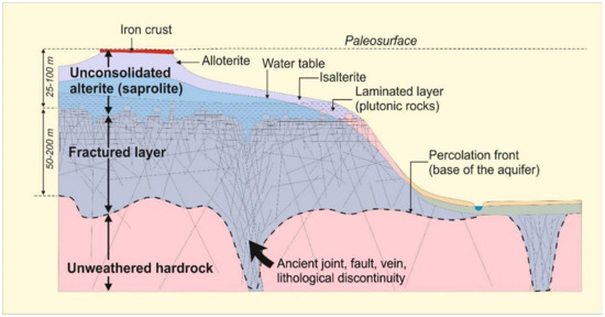 Previously considered mainly as being tectonic in origin [8,9,10,11,12] with fractures mostly subvertical, it has now been demonstrated in most regions of the world that this permeability is due to the development of stratiform weathering profiles several tens of meters thick (see in particular [1,13], who propose a detailed bibliographical review of these different concepts and the presentation of associated hydrogeological conceptual models). This conceptual model is briefly described in Section 2. Similar results were also obtained on different types of rocks, such as carbonate rocks [14,15,16].
