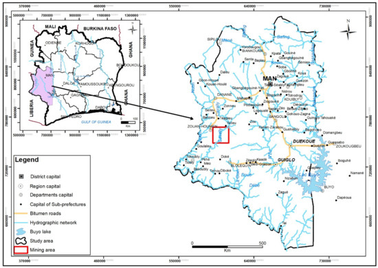 The Montagnes District lies in the Western Côte d’Ivoire (Figure 2). It is located between latitudes 5°50 and 8°00 N and longitudes 7°00 and 8°40 W. Covering an area of about 31,000 km2, its capital is the city of Man. Its population is estimated at more than 2,400,000 inhabitants, with an average demographic density of 76 inhabitants/km2 [28]. The main activities of the rural population are based on agriculture (rice, bananas, sweet potatoes, cassava, cocoa, coffee, cotton, cola) and mining (industrial and artisanal), which has been developing significantly in recent years. The largest industrial gold mine in Côte d’Ivoire is at Ity in the commune of Zouan-Hounien, with an annual production of 6 to 7 tonnes. Fishing, livestock breeding, and tourism are secondary activities [29].