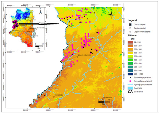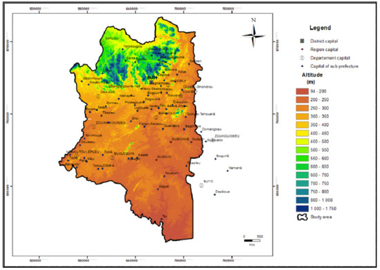 A Digital Elevation Model (DEM) of the Montagnes District was used in this study. It is from the Shuttle Radar Topography Mission (SRTM) altimetry data, created in February 2000 and downloaded from http://earthdata.nasa.gov/ (accessed on 12 March 2020). The SRTM data are provided in the form of grids, made up of squares of 1 arc degree (about 30 metres) sides, with geographic coordinates (X, Y, and Z) based on the WGS84 data. From an image mosaic, 12 squares covering the study area were assembled in ARCGIS.10.2. (using the mosaic function) to provide a DEM coverage of the entire Montagnes District. The accuracy announced by NASA is +/− 20 m in planimetry (X and Y) and +/− 16 m in Z (for absolute heights). Checks were carried out, and they show that the DEM is relatively “smooth”, with no significant unjustified variations between neighbouring meshes.