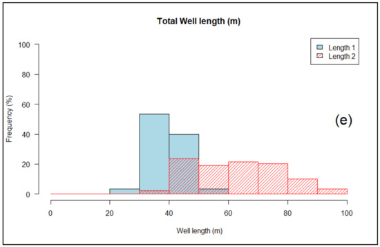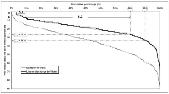 where Lu (m) is the “useful thickness” of the fractured layer (defined either through the slope or the percentile method, see above in [24]); qM(Lu) is the mean linear discharge (m3/h/m) evaluated for the “useful thickness” Lu; j(Lu) is the corresponding number of wells; and QM(Lu) is the resulting mean discharge (m3/h) for “theoretical” wells that would intersect the whole “useful thickness” (length Lu) of the fractured layer.