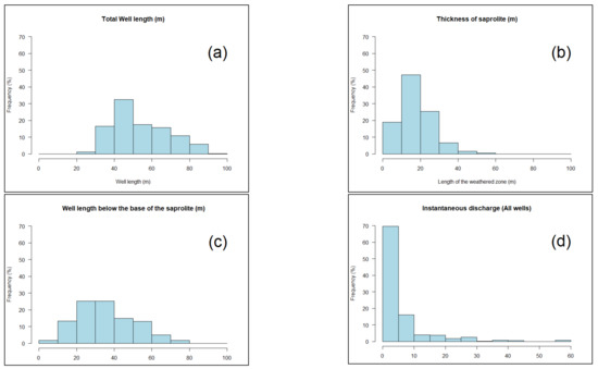 Because of the thickness of the saprolite and the instantaneous discharge (i.e., air lift discharge measured at the end of the drilling by blowing air under pressure at the bottom of the well and providing a first estimate of the aquifer’s transmissivity (e.g., see [21]), being two key parameters in this study, a pre-processing was performed first. Thus, all the boreholes that did not provide information on these parameters were eliminated from the ONEP borehole database.