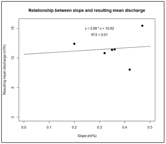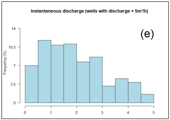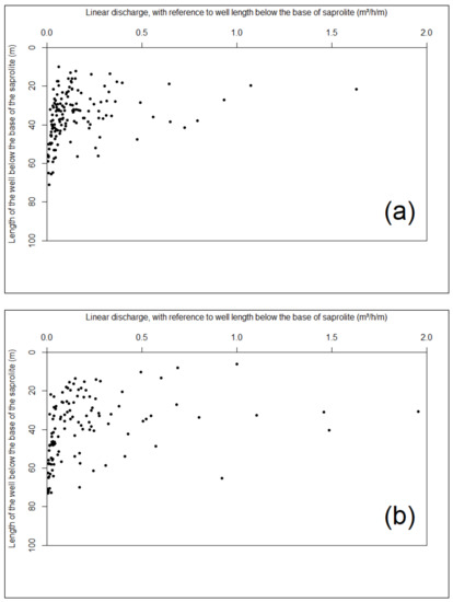 The mean linear discharge for the analysed dataset is between 0.18 and 0.34 m3/h/m (the median is 0.26 m3/h/m). The deduced mean discharge for the most productive part of the fractured layer is between 8 and 15.4 m3/h. The authors of [52] demonstrated that the mean linear discharge and mean discharge for this useful thickness were 0.13 m3/h/m and 5.21 m3/h, respectively, in the granitoid aquifers. These values are similar to those obtained by [37], who demonstrated that, for a set of 42 geological formations, the linear discharge is between 0.078 and 0.84 m3/h/m (average 0.38 m3/h/m). They estimated that the discharge of the useful fractured layer varies from 3.8 to 42.6 m3/h (Table 9). These results are therefore relatively close to those obtained in this study.
