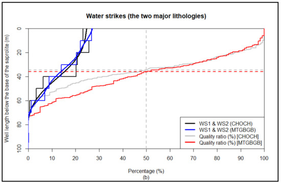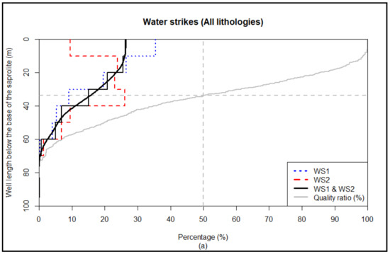 However, in order to reduce the likely influence of statistical bias that the lack of data in the ONEP database for deep boreholes might have on the interpretation of the frequency of water strikes under the saprolite, a quality ratio was calculated. The range of acceptability was chosen to be above 50%, according to the work of [20]. The number of boreholes through a given depth expressed as a percentage (quality ratio), in which the maximum number of water strikes below the saprolite was recorded, was determined according to Equations (1) and (2) below: