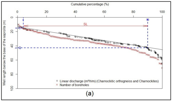 For the purpose of this paper, the curve indicating the cumulative number of boreholes has not been shown. Only the cumulative linear discharge curve was considered for the characterisation of the parameters of the fractured layer. The evolution of the cumulative percentages of linear discharge under the saprolite for a given lithological unit has five parameters, named a, b, c, SL1, and SL2 (Figure 5):