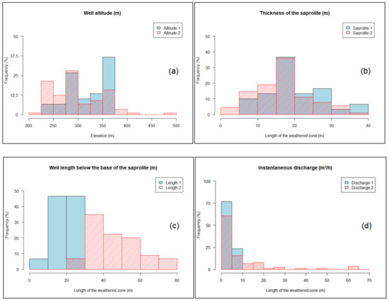 Finally, this study was mainly based on the use and processing, by means of various statistical methods, of a hydrogeological database of several hundred boreholes made available by the Office National de l’Eau Potable (ONEP) and concerning Western Côte d’Ivoire. Such databases have already been used in previous research projects and have shown their value (see for instance [3,21,22,23]), despite the relatively basic nature of the data available (total depth of the borehole, lithology, depth of the base of the loose alterite (saprolite), discharge at the end of the drilling, number and depth of the main water strikes, piezometric level, etc.).