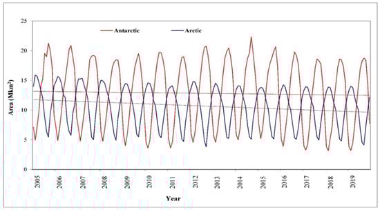 The nonparametric Mann–Kendall (MK) trend test [70,71,72] is commonly used to identify significant and nonsignificant trends in climatic variables [73,74,75]. In this study, the MK test was employed to assess trends in ice sheet area over the Antarctic and Arctic. Polar ice sheets are significant indicators of climate change, as they respond to raised temperatures with increased melt, enhanced mobility, and increased iceberg calving [76]. The MK test and Sen’s slope estimator results, using data obtained from the NSIDC, indicated that ice sheet area significantly decreased in the Arctic region across all months during 2005–2019. Ice sheet area over the Antarctic region did not show a significant decreasing or increasing trend during February, June, July, August, September, October, and December between 2005 and 2019 (Figure 3; Table 3). The MK test results for seasonal scale showed that all seasons (spring, summer, autumn, and winter) experienced significant decreasing trends in ice sheet area in the Arctic region. However, over the Antarctic region, the results indicated that significant changes (decreasing trend) only occurred in spring, summer, and autumn (winter had a nonsignificant decreasing trend) during 2005–2019 (Table 3).