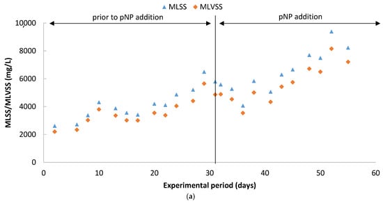 The effects of the metabolic uncoupler pNP on sludge reduction and nutrients’ removal were investigated by introducing pNP during the operation of an MBR without removing biomass from the system. Prior to pNP addition, activated sludge concentration was gradually increased from 2620 and 2200 mg/L to 6500 and 5650 mg/L MLSS and MLVSS, respectively (Figure 2a). A transient reduction in biosolids concentration was observed after pNP addition, resulting in MLSS and MLVSS content as low as 4070 and 3540 mg/L, respectively (Figure 2a). A week afterwards, an increase in activated sludge concentration was observed, reaching values that exceeded 8000 mg/L, indicating the adaptation of activated sludge microbiota to the selective pressure of pNP through either resistance or degradation (Figure 2a). Thus, the biological system restored its ability to synthesize biomass in a period of 7-HRTs after the introduction of the uncoupler.