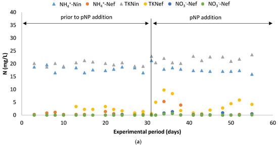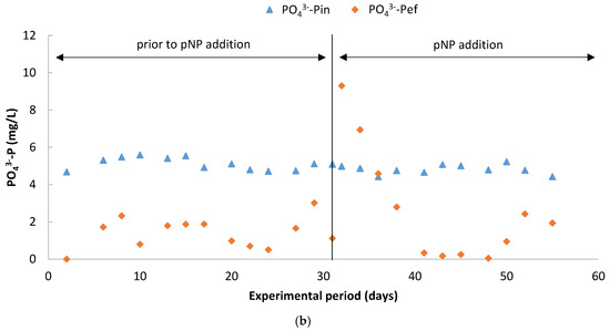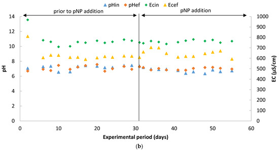 No difference between influent and effluent pH was observed prior to pNP addition, with the respective values being equal to 7.18 ± 0.08 and 7.09 ± 0.08 (Figure 2b). However, pNP addition resulted in steadily higher pH values in the effluent compared to the influent (p < 0.05, in Student’s t-test) (Figure 2b). In contrast, effluent EC was always lower than influent EC prior to pNP addition (p < 0.01) (Figure 2b). Moreover, pNP increased EC values from 608 to 703 µS/cm prior to and after the addition, indicating a disturb in metabolic processes, affecting the removal of ionic compounds (Figure 2b).