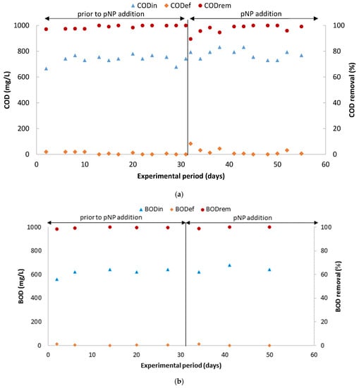 The COD removal efficiency was affected by the addition of pNP, causing a sharp increase in effluent COD concentration from 7.88 ± 2.42 mg/L prior to pNP addition to 83 mg/L after the application of the uncoupler (Figure 3a). This corresponded to COD removal efficiency decrease from 99.0 ± 0.3% to 89.5% prior to and immediately after the addition of pNP (Figure 3a). A drastic reduction of COD removal efficiency by 17% was also observed by Tian et al. [3] after the addition of the uncoupler 2,6-dichlorophenol. Furthermore, BOD concentration reduced from 628 ± 12 mg/L in the influent to 3.9 ± 1.4 mg/L in the effluent, with BOD removal efficiency being equal to 99.4 ± 0.2% throughout the experimental process (Figure 3b). However, a slight increase in the effluent BOD concentration from 2 to 10 mg/L was observed by the introduction of pNP and up to 1 week afterwards.
