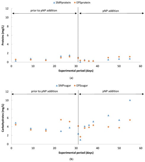 Proteinaceous SMP were higher than the respective EPS prior to pNP addition, while a reversible trend was observed after the introduction of metabolic uncoupler (Figure 5a). Moreover, the content of SMP and EPS of protein nature decreased immediately after the pNP addition, whereas their concentrations were restored 1 week afterwards the introduction of the metabolic uncoupler (Figure 5a). On the other hand, after a period of sludge adaptation (first 2 weeks of operation), carbohydrate SMP were lower than carbohydrate EPS prior to pNP addition, whereas the opposite trend was observed after the introduction of the uncoupler (Figure 5b). In addition, a drastic drop in their content occurred immediately after the addition, indicating, as in the case of proteinaceous SMP and EPS, an intensive effect on cell synthesis (Figure 5b). Similar to our study, a sharp reduction in proteinaceous EPS was reported by Zhang et al. [32] at high concentrations of nitrophenols-NP (>100 mg/L 2-NP, >50 mg/L 4-NP and >10 mg/L 2,4-DNP). Moreover, Fang et al. [33] found a reduction in the content of SMP during the addition of the uncoupler of ortho-chlorophenol in an SBR, but not in that of EPS. However, in accordance to our study, both Feng et al. [34] and Lin et al. [35] reported that EPS secretion decreased in the addition of the uncoupler TCS.