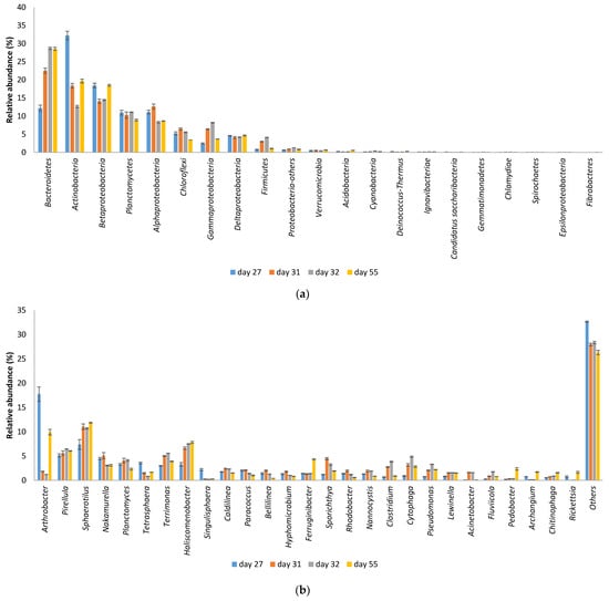 Effect of para-nitrophenol on activated sludge communities (a) at class-phylum and (b) genus level during operation of the MBR system prior to (days 27 and 31) and after (days 32 and 55) uncoupler’s addition. Analysis of Variance (ANOVA) of the relative abundances of activated sludge taxa at phylum-class and genus level is presented in Tables S1 and S2, respectively.