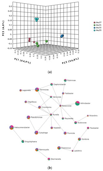 Schematic illustration of (a) beta-diversity based Principal Coordinates Analysis (PCoA) and (b) correlation network of activated sludge microbiota during operation of the MBR system prior to (days 27 and 31) and after (days 32 and 55) para-nitrophenol addition.