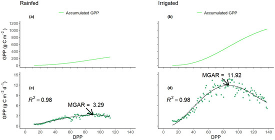 3.4. Dynamics of Daily and Accumulated Gross Primary Production—GPP