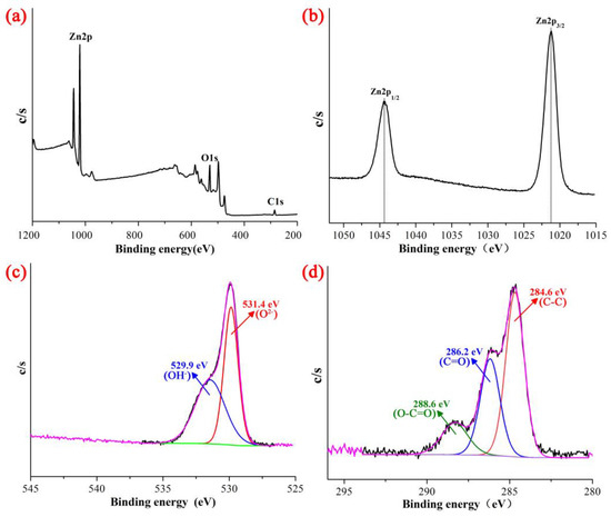 Element composition: the EDS analysis results are shown in Figure 3b and Table 1. The ZnO NPs prepared by the solvothermal synthesis method only contained Zn and O and did not contain other impurities. The relative weight percentages of Zn and O in the ZnO NPs were 84.27% and 15.73%, respectively, and the atomic percentages were 56.74 and 43.26%, respectively. XPS was used to analyse the chemical state and elemental composition of the ZnO NPs, and the results are shown in Figure 4. The percentages of O and Zn atoms in the ZnO NPs were 39.16% and 41.28%, respectively, which is close to a 1:1 ratio. As shown in Figure 4b, the Zn 2p spectrum of ZnO has two peaks at 1044.7 and 1021.5 eV, and the binding energy interval between these two lines is 23.2 eV, which is within the standard reference value range of the ZnO wurtzite structure. This result indicates that Zn ions are present in the normal Zn2+ valence state in the nanocomposites [20]. As shown in Figure 4c, the O 1s spectrum of ZnO has two peaks at 531.4 and 529.9 eV. The main peak at 529.9 eV is related to the lattice oxygen species (O2−) in the Zn-O bond of the wurtzite structure, while the main peak at 531.4 eV is related to the chemically adsorbed oxygen species (OH−). The relative surface hydroxyl content is 1.07. The C 1s spectrum of ZnO in Figure 4d has three peaks at 284.6 eV, 286.2 eV, and 288.6 eV, as does the standard C 1s spectrum that shows (C-C), (C=O), and (O-C=O) bonds. There is no XPS signal corresponding to the Zn-C bond in the Zn 2p orbital or the C 1s orbital (approximately 281 eV), indicating that carbon is not doped in the ZnO NPs [21,22].