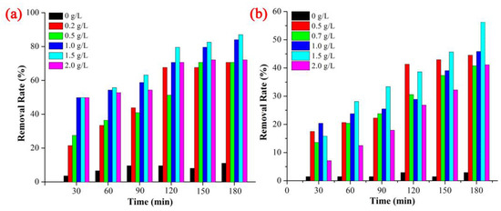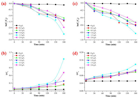 These results indicate that when the amount of catalyst is small, the concentration of catalyst in the reaction system is small, the adsorption capacity of the degraded material is weak, and the ultraviolet light of the system cannot be fully utilized. Therefore, the photocatalytic activity is poor, and the rate of pollutant degradation is low. With the increase in the amount of catalyst, the amount of adsorption on the degraded materials increases, and the number of electron–hole pairs generated by ZnO increases, which is beneficial for improving the photocatalytic activity of ZnO in the photocatalytic reaction — and the degradation rate of pollutants increases. However, when there is too much catalyst, the turbidity of the solution increases and the transmittance decreases, and the ZnO NPs cause the reflection of incident light, which affects the utilization rate of the light source; the number of electron–hole pairs decrease, leading to the photocatalytic activity of the catalyst and the degradation rate of pollutants.