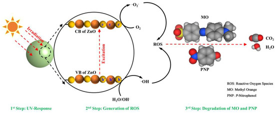 The band structure of the ZnO NPs consists of a low-energy valence band filled with electrons and a high-energy conduction band not filled with electrons, and there are gaps between the valence band and conduction band. When the ZnO photocatalyst is irradiated by light with an energy greater than or equal to the band gap, the electron absorption energy in the valence band is excited to transition to the conduction band, and the corresponding holes are generated in the valence band, forming electron–hole pairs [26,27,28]. The electron–hole pair migrates to the particle surface under the action of a space electric field. The hole can react with H2O and OH- to generate the hydroxyl radical ·OH, and the electron can react with O2 to generate the superoxide radical ·O2−. ·OH and ·O2− are the key reactive oxygen species (ROS) in the photocatalytic progress of ZnO NPs. These ROS (·OH and O2−) have strong oxidation abilities and can react with organic pollutants. The pollutant then degrades into CO2, H2O, and other substances [29]. Figure 8 illustrates the entire process clearly. The specific reaction process is shown in the following equations: