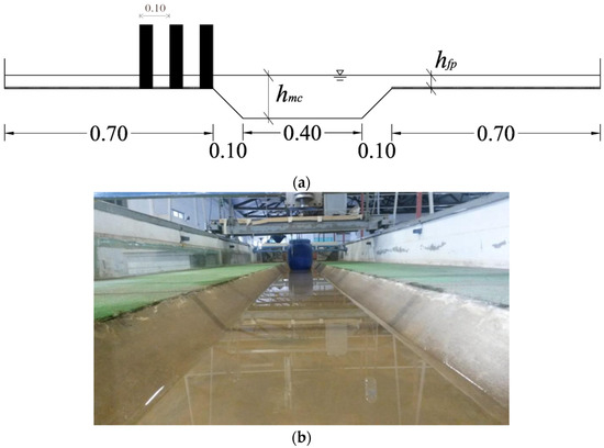 The experimental tests were conducted in the 10 m long prismatic and symmetric compound channel at the National Laboratory for Civil Engineering in Portugal (LNEC). The cross-section of the main channel is trapezoidal, while that of the floodplain is rectangular. The height of the main channel is 0.10 m and the slope of the margins (V:H) is 1.0. The exact dimensions are shown in Figure 2.