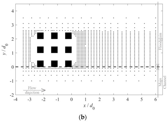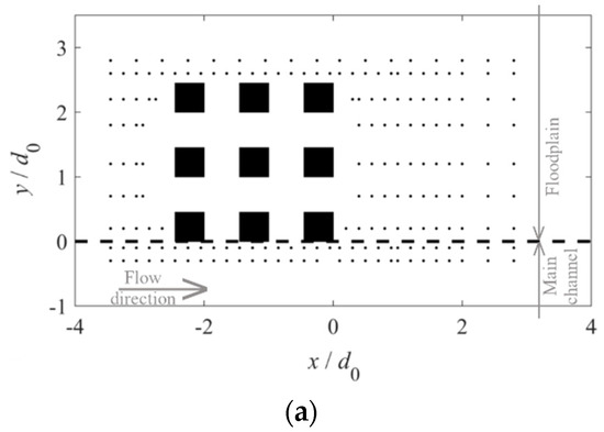 The experimental array is composed of nine square cylinders with width d = 0.045 m. It was placed at the interface between the main-channel and the flood plain, forming a grid orthogonal to the channel axis, as depicted in Figure 3. The distance d0 between two consecutive cylinders was kept equal to 0.10 m. Spacing and sizing were chosen so as to align with those of the experiments carried out in the context of FlowRes ANR, a project oriented to the investigation of compound-channel flows with transition in bed roughness, described in [39]. The tests were run under uniform-flow conditions in the compound channel. To establish uniform flow in the channel, the total discharge Q was initially distributed in the main channel (Qmc) and in the floodplain (Qfp), according to the weighted divided channel method proposed by [40]. The cylinders were emergent under the tested flow conditions.