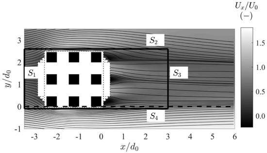 Distribution of time-averaged streamwise velocities and streamlines at z = z0 for SA_04. Black lines represent the vertical surfaces of the control volume.