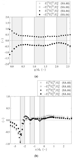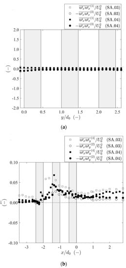 The values of the turbulent transport , normalized with the scale velocity U0, are shown in Figure 6a,b. The variable is also referred as stress, since it expresses the Reynolds stress per unit fluid density. The values of the stresses, both normal and shear, are smaller than those of the convective fluxes. This observation is highlighted by the use of the same scale of the vertical axis in Figure 5a and Figure 6a. The stress values in S1 and S3 (Figure 6a) resemble the distribution of the streamwise convective momentum transport (Figure 5a) featuring higher values at the main-channel/floodplain. Stronger stresses near the interface (y/d0 = 0) are typical of compound-channel flows [23], which suggests that these peaks are not due to the presence of the array. The corresponding peak for S3 is larger in both tests, compared to that of S1. This observation implies that there is an excess in the stress, generated by interaction of the wake flow in the near-interface cylinder and the shear flow. This effect seems more pronounced in the case of test SA_03–lower submersion.