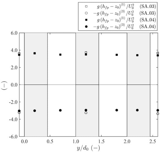 The terms of Equation (3) were calculated for a control volume with b = 2.7d0, l = 6.25d0 (note that the plan view of the control volume also shown in Figure 4) and h = 0.06hfp. The momentum fluxes and the Reynolds stresses computed from the velocity measurements at z0 = hfp/3 (section S5) and z = hfp/3−0.06hfp (section S6) confirmed that net momentum flux across sections S5 and S6 is negligible and that the vertical variation of the turbulent stresses is small, justifying the application of Equation (4). All values are normalized with powers of the reference velocity U0 estimated for each test. The values of the terms of Equation (4) are shown in Figure 5, Figure 6 and Figure 7.