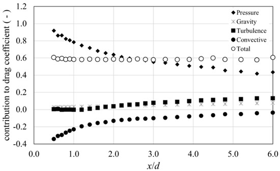 The different net contributions for the different control volumes are shown in Figure 9, for the case of test SA_04, for which the density of measurements was higher. Each contribution corresponds to its array-averaged value divided by the reference stagnation pressure and by the exposed cylinder area . As an example, the pressure contribution corresponds to . The simple sum of all the contributions is the value of the drag coefficient. It is verified that the values of the drag coefficient are not significantly sensitive to the location of the downstream boundary. As examples, the values of the drag coefficient for , and are 0.583, 0.578 and 0.580, respectively.