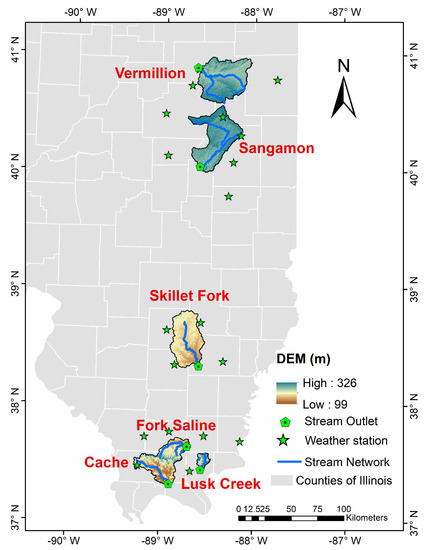 Considering the quality and quantity (temporal duration) of the available data, six different HUC-8 watersheds within the state of Illinois were chosen as samples for this study. The six watersheds, i.e., Vermillion, Upper Sangamon, Skillet Fork, Lusk Creek, Fork Saline, and Cache, represent different LULC and soil conditions (Table 1). Of the six watersheds, the first three are predominantly agricultural watersheds, and the remaining three are dominated by forest and grassland (Figure 1). The Vermillion and Sangamon watersheds are located in the previous prairie zones, while Skillet Fork lies in the savannah zone. The remaining three southern watersheds are located in the previously densely forested region. The elevation varies from 99 m to 326 m (Figure 1); whereas the area of the watersheds ranges from ~111 km2 to ~1500 km2 (Table 1). The mean annual precipitation varies from 356 to 1553 mm in the watersheds located in the northern part of Illinois (i.e., Vermillion, Sangamon and Skillet Fork); whereas, it varies from ~774–1830 mm in the southern watersheds (i.e., Fork Saline, Cache and Lusk Creek).