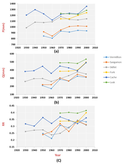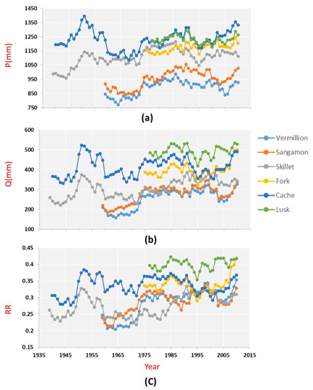 10 year moving average of the (a) precipitation (P), (b) runoff (Q), and (c) runoff ratio (RR).
