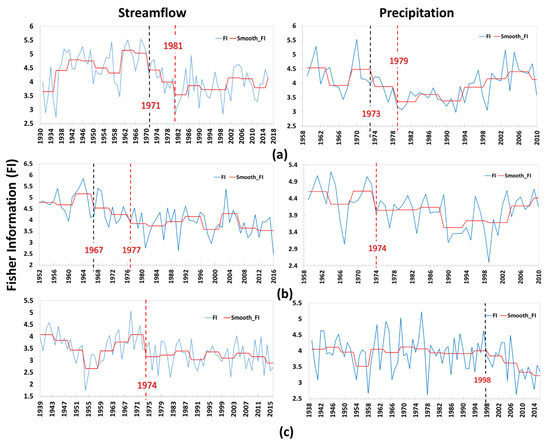 Analyses of regime shifts of annual streamflows and precipitation time series using Fisher Information for (a) the Sangamon watershed; (b) the Vermillion watershed, and (c) the Skillet watershed. The black and red (dashed) vertical lines show the start of transition from one regime to the another and starting of new regime (year of regime shift), respectively.