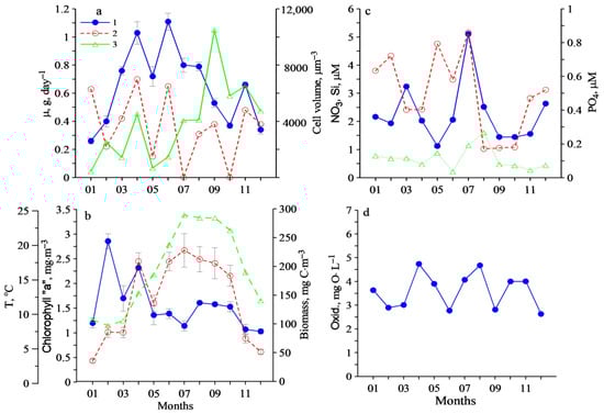 Seasonal variability: (a) phytoplankton growth rate (1), microzooplankton grazing (2) and average phytoplankton cell volume (3); (b) chlorophyll a concentration (1), phytoplankton biomass (2), water temperature (3); (c) nitrate (1), silicate (2), phosphate (3); (d) the permanganate oxidizability (1) in Station 2.