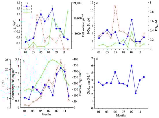 Seasonal variability: (a) phytoplankton growth rate (1), microzooplankton grazing (2) and average phytoplankton cell volume (3); (b) chlorophyll a concentration (1), phytoplankton biomass (2), water temperature (3); (c) nitrate (1), silicate (2), phosphate (3); (d) the permanganate oxidizability (1) in Station 1.
