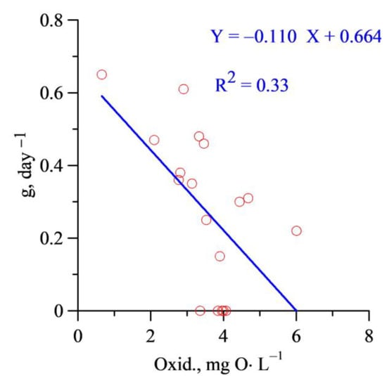 Based on the value of the determination coefficient, it can be concluded that more than 30% of the grazing rate variability in the warm period is caused by the different concentrations of dissolved organic matter in the water. Statistical analysis confirmed the reliability of the obtained dependence: the F-criterion was 7.80 at p = 0.013, the coefficient of the equation is significant at p = 0.013. During the cold period, such dependency was not observed. As for the growth rate, there was no regression dependency between this parameter and oxidizability.However, for the warm period, it was determined that with an average permanganate oxidizability value of 2.80 mg O·L−1 (ranging from 0.66 to 3.53 mg O·L−1), the value of the phytoplankton growth rate was 0.92 day−1. With an average oxidizability value of 4.36 mg O·L−1 (range 3.85–6.01 mg O·L−1), the average value of the phytoplankton growth rate decreased to 0.64 day−1. Statistical analysis confirmed the significance of the differences in the obtained average values of the growth rate (criterion t = 2.48 with a critical value of 2.14).