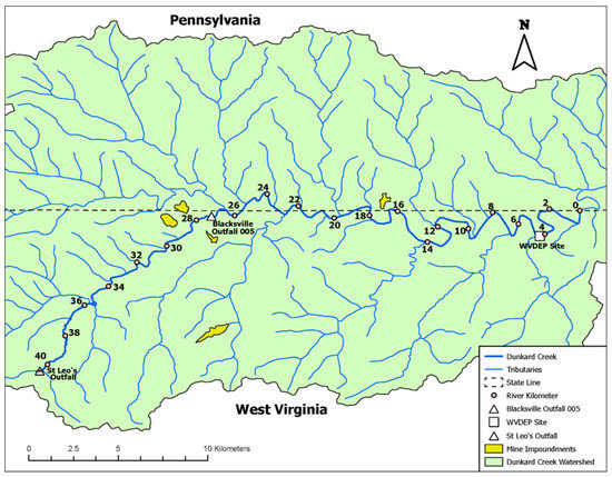 Location of the case study on Dunkard Creek, WV-PA) documenting the aquatic life kill and subsequent recovery over 10 years (2009 to 2019). Included are NPDES permits for surface and ground water discharge from several pumped mine treatment stations (Consol Energy outfall 005 at Blacksville No. 2 mine and Consol Energy St. Leo mine outfall), slurry impoundments, two active deep coal mines (Pentress and Blacksville #2). Distances in river kilometers moving upstream from where Dunkard Creek exits West Virginia for the last time are shown to identify locations related to water quality and fish sampling. A long term WVDEP water quality monitoring station is shown by the square.
