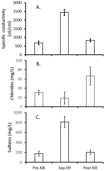 Water quality conditions at RKM 4.3 on Dunkard Creek during the pre-kill period (15 June 1976–17 August 2009), the kill (9–23 September 2009), and post-kill (19 October 2009–21 December 2010). Shown are specific conductivity (A), chlorides (B) and Sulfates (C). Error bars represent 95% confidence limits on mean values.