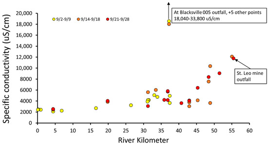 Water quality and a golden algae bloom appeared to play a part in the aquatic life kill. Water quality was measured by the WVDEP, USEPA and by West Virginia University (WVU) during the kill. Specific conductivity was measured at 9 sites by WVDEP from RKM 0–27.0 on 2–4 September 2009. Conductivity ranged from 33,800 uS/cm immediately downstream of the Blacksville 005 outfall (RKM 27.0) to 2280 uS/cm at RKM 0. On 9 September 2009 the USEPA collected water quality information at 10 sites from RKM 4.5 to RKM 27.0. Specific conductivity ranged from 2257–5085 uS/cm in the Dunkard Creek mainstem and was over 18,000 uS/cm in the vicinity of the Blacksville 005 outfall (Figure 2 and Figure 4; Table 1). WVDEP collected water quality measures at 16 sites between 9 to 22 September 2009. WVU collected conductivity measures at 17 sites on 28 September 2009. In general, during September 2009 specific conductivity declined moving downstream from RKM 40.5 (St. Leo mine outfall) until RKM 27.0 where inputs from the Blacksville 005 outfall caused specific conductivity to increase (Figure 4).