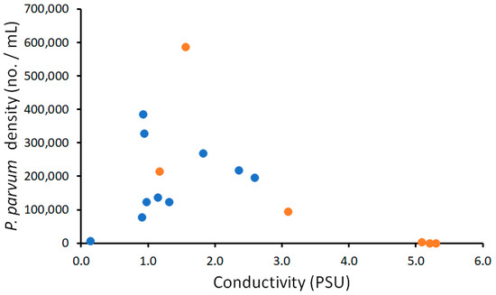 Microscope counts of P. parvum cell densities relative to water sample conductivity in waters of Dunkard Creek during the golden algae bloom and associated aquatic life kill in September 2009. Orange symbols represent samples collected by WVDEP and blue symbols were collected in the Pennsylvania waters by Pennsylvania Fish and Boat Commission. Highest cell densities were associated with 1–2 PSU.