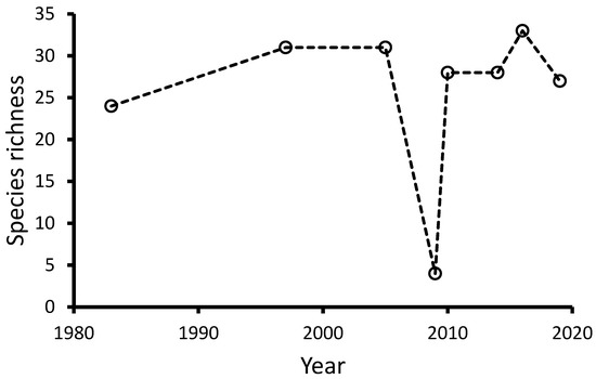 Fish species richness collected at the Pentress, WV site on Dunkard Creek 1983–2019. Only 4 species and 19 individuals were collected in 2009 following the Prymnesium parvum bloom.