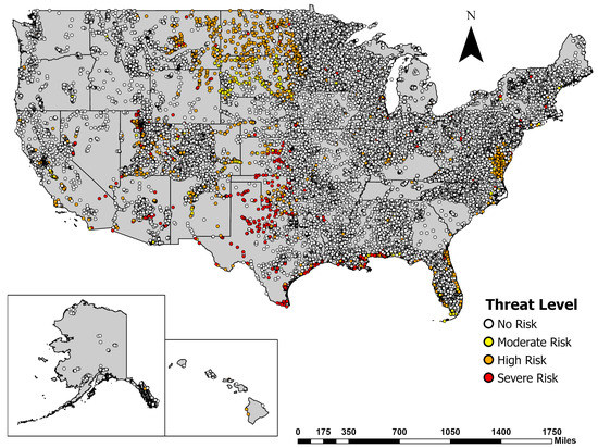 The national dataset using only conductivity as criteria for P. parvum risk contained data from 52,810 stream/river sites. Of the 52,810 sites, 5217 displayed a maximum specific conductivity of 1500 uS/cm or greater. Thus, 9.88% of all sites reported conductivity high enough to support P. parvum between May and October (Figure 7). Of the sites exceeding the conductivity threshold, 3585 sites (6.79% of all sites) exceeded either the pH or chloride threshold and 1036 (1.96% of all sites) were rated as severe risk by exceeding all three thresholds. The majority of Severe risk sites were clustered in Texas, Oklahoma, and the southwestern U.S., although Severe risk sites could be found in 30 of the states (Figure 7).