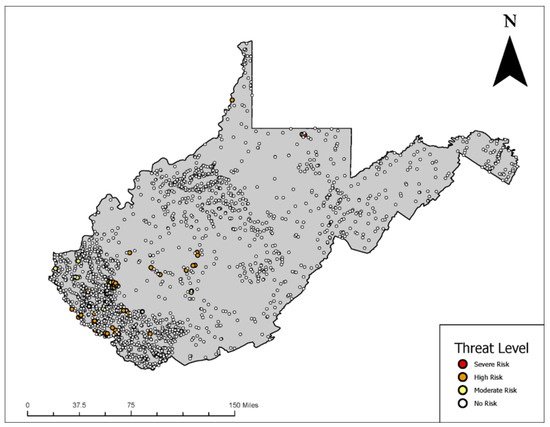 Spatial map of West Virginia showing the risk of Prymnesium parvum based upon water quality criteria. Data are from the WVDEP dataset from May–October 2015–2020. Sites with specific conductivity <1500 uS/cm were considered as No risk. If a site met or exceeded 1500 µS/cm we considered it at Moderate risk for P. parvum. Sites that exceeded the specific conductivity threshold and either exceeded chloride level threshold (228 mg/L) or had pH > 7.5 were classified as High risk. Sites for which all three criteria thresholds were exceeded were considered at Severe risk for P. parvum.