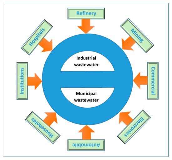 The goal of wastewater treatment (sources, Figure 1) is to reduce/remove inorganic and organic components, harmful chemicals, kill pathogenic bacteria, and so on [,,]. As a result, the quality of treated water is improved to satisfy the criteria of WHO guidelines or an individual country’s pollution control body. Pollutants in municipal and industrial wastewater vary depending on location [,]. As a result, the forms of wastewater treatment are determined by the nature of the wastewater and the necessary quality of water after treatment.