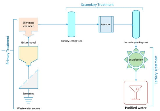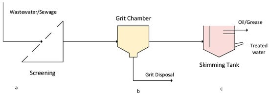 This procedure (Figure 3) consists of two sequential steps: preparatory treatment and sedimentation [,]. Screening, grit chambers, and skimming tanks are used in preliminary treatment to remove big particles and debris from wastewater, oil, and fats. In addition, the wastewater is sedimented or chemically precipitated in primary settling tanks, which eliminates organic solids, colloidal and finer suspended particles as sludge.