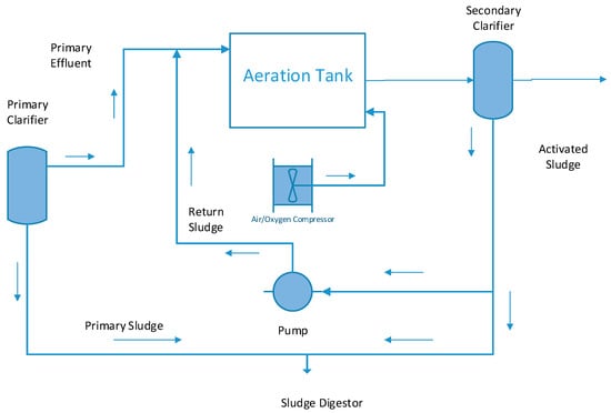 Biodegradable soluble organic molecules are degraded by microorganisms during the secondary treatment process (Figure 4) []. In the presence of oxygen, suitable microorganisms feed on the wastewater, expanding their population by devouring organic matter as feed. In general, biochemical oxygen demand (BOD) is employed as a wastewater measurement parameter; when organic matter is eliminated, the BOD level falls []. This biological unit process is further subdivided into two types: suspended growth systems and attached growth systems. The wastewater circulates around and through the free-floating microorganisms in the suspended growth system, forming biological flocs that sink at the bottom. The settling flocs contain microorganisms that are recycled back into the wastewater treatment process. Suspended growth systems include activated sludge processes and aerated lagoons. Attached-growth processes, on the other hand, employ media such as a fixed bed of gravel, ceramic, or plastic media to hold and grow microorganisms. The wastewater runs over the media, forming a biofilm that thickens with growth and falls or is removed as sloughing. The same is true for trickling filters and rotating biological contactors (RBC).