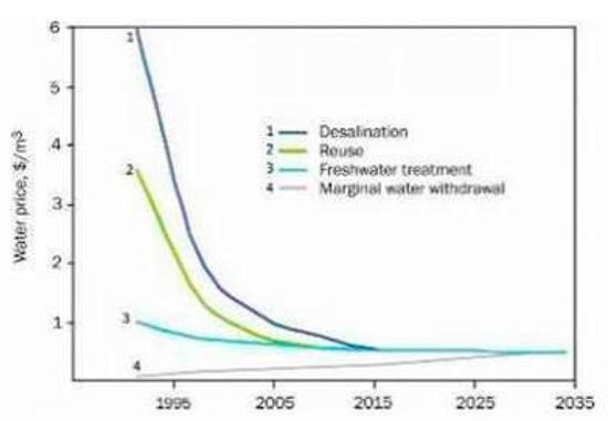 Common methods to remove heavy metals such as Cu2+ and Ni2+ from industrial water include chemical precipitation, ion exchange, cementation, coagulation and adsorption. While reverse osmosis (RO) is used to remove NaCl. The Locations of H2O on earth depicted in Figure 5 while the progress of the water reclamation cost from different sources is shown in Figure 6. Salty H2O feed (brackish water/seawater/groundwater), low salinity products of H2O, and very salty H2O were removed. Desalinated water is suitable for most household, industrial and agricultural uses. Various organic and inorganic membranes include mixing membranes such as polyvinyl alcohol and PVAsago starch recovered ethyl acetate. The bioreactor FO cellulose triacetate membrane removes 98% of organic carbon and 90% of ammonium nitrogen; polymeric ceramic membranes (zeolite-coated ceramic films and catalytic nanoparticles, hybrid organic-inorganic nanocomposite membranes and biofilms such as hybrid protein-polymer biomimetic membranes, zeolite and catalytic films) are reasonably removed from commercial practice and yield improvements of a low-to-moderate performance [].