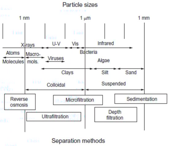 Schematic diagram of the filtration spectrum of related separation processes and separated components []. Reproduced with permission from Ikhsan, S.N.W.; Yusof, N.; Ismail, A.F.; Salleh, W.N.W.; Aziz, F.; Jaafar, J.; Hasbullah, H, Synthetic Polymeric Membranes for Advanced Water Treatment, Gas Separation, and Energy Sustainability; published by Elsevier, 2020.
