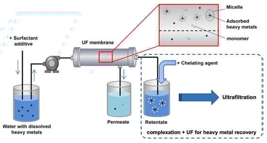 Schematic illustration of MEUF for heavy metal recovery []. Reproduced with permission from Wenten, I.G.; Khoiruddin, K.; Wardani, A.K.; Widiasa, I.N., Synthetic Polymeric Membranes for Advanced Water Treatment, Gas Separation, and Energy Sustainability; published by Elsevier, 2020.