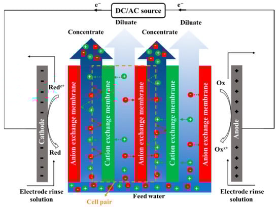 Figure 9 depicts an ED cell configuration. CEM and AEM are alternately arranged between an electrode pair in ED. A spacer separates the membranes to form compartments or chambers. Ions are attracted toward the electrode with the opposite charge when electrolyte solutions are transferred into the compartments and a potential difference is established on the electrode. Deionization occurs in the dilute compartment while enrichment occurs in the concentrate chamber due to the selective separation performed by the membranes. This process produces two streams with different ion concentrations, namely dilute and concentrated ED was initially commercialized as a RO alternative for brackish water desalination during its early development []. Unlike RO, which is limited by osmotic pressure, ED can achieve a high level of water recovery. In the concentrate chamber, ED can also be used to achieve a high concentration factor. This ability is used to concentrate seawater during the production of table salt []. Furthermore, due to its lower scaling tendency, ED necessitates less complicated pretreatment. Furthermore, the low operating pressure makes the ED system simpler than the RO system. However, ED is only competitive in desalination for low to moderate salinity because energy consumption increases with ionic concentration.