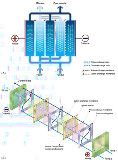 Electrodeionization (EDI). (A) Schematic illustration of deionization process and (B) stack construction []. Reproduced with permission from Wenten, I.G.; Khoiruddin, K.; Wardani, A.K.; Widiasa, I.N., Synthetic Polymeric Membranes for Advanced Water Treatment, Gas Separation, and Energy Sustainability; published by Elsevier, 2020.
