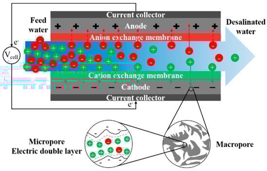 Schematic illustration of membrane capacitive deionization (MCDI) process [].